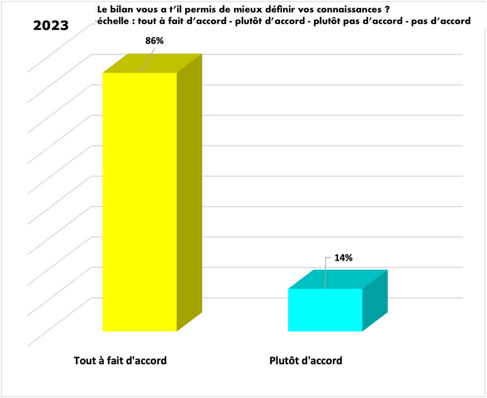 Ces statistiques sont issues de nos questionnaires de satisfaction (à chaud / à froid) remis à nos bénéficiaires à l’issue de leur accompagnement. Année de Référence 2023 -Nb de bénéficiaires 129 / Année de Référence 2022 -Nb de bénéficiaires 144